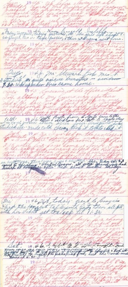 13 Wed. I worked on the envelopes & statements for two hours this morning. Mr. P. & I were there this afternoon. I worked from 2.15 until five. Came home & Doris & I went to the Hostess Club where we helped the Red Cross serve the Anglican Ladies. Had our supper there, which was very nice. Did the dishes & came home. Practiced a Hymn for Sunday. Had Ross Jitterbugging.