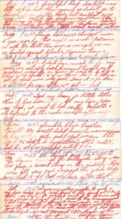 27 Thurs. Terrible Choir Practice tonight. Mr. Sorrell didn’t know he was supposed to sing certain parts, and it upset everyone. A lot left at 9 o’clock to Dr. Campbells Party at the Mental, but the rest of us practiced until 9.30.