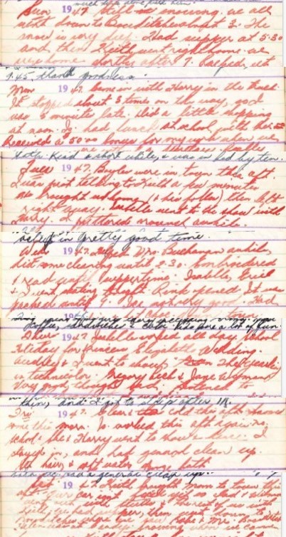 22 Sat. Keith brought Mom to town this aft. Our car isn’t fixed yet so Dad & Wilma went out with Stutts & the rest of us with Keith, we had supper, then went down to Bowditches where we saw Babe & Mrs. Bowditch. Helen was a Candys. Snowing when we came home, so Keith stayed here overnight.